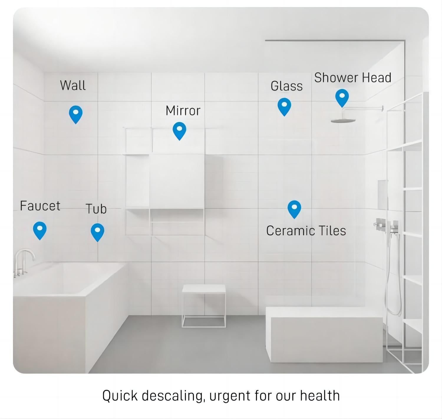 Suitable for: Tiles, sinks, showers, bathtubs, and all bathroom surfaces