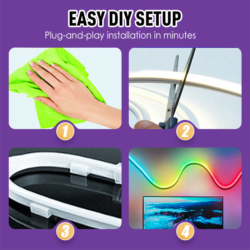FLEXIBLE DESIGN, EFFORTLESS SETUP – Bend it. Twist it. Shape it your way. This ultra-flexible strip installs in minutes, adapting to any surface or contour with ease. Frame your monitor, trace your walls, or light up your desk—it’s plug-and-play creativity for your unique style.
