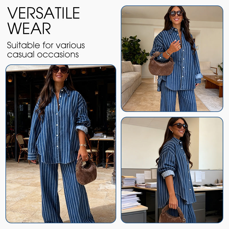 CLASSIC STRIPE DESIGN - Featuring a timeless vertical stripe pattern, this two-piece set exudes sophistication and modern charm. The evenly spaced stripes create an elongating effect, visually enhancing body proportions while maintaining a refined and elegant aesthetic. Whether for daily wear or relaxed gatherings, this design offers a polished look that never goes out of style.